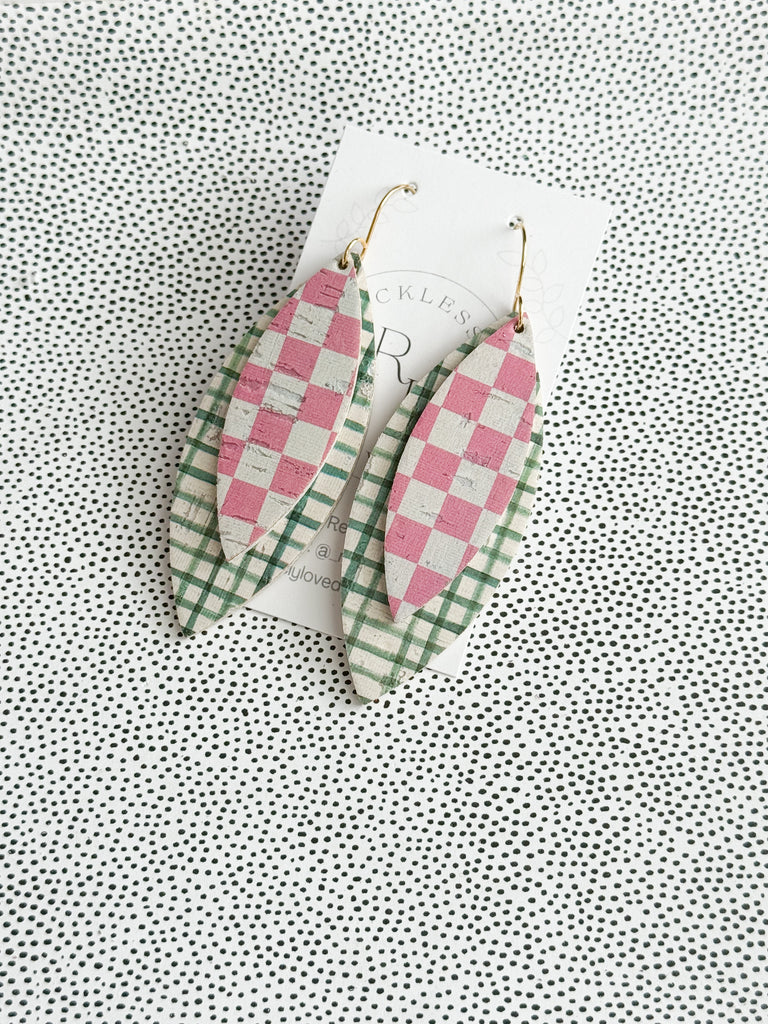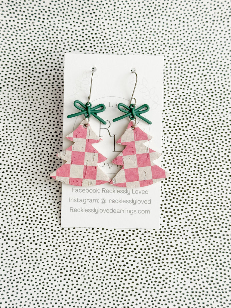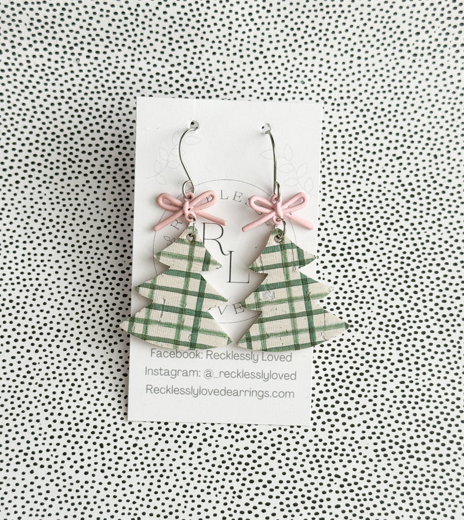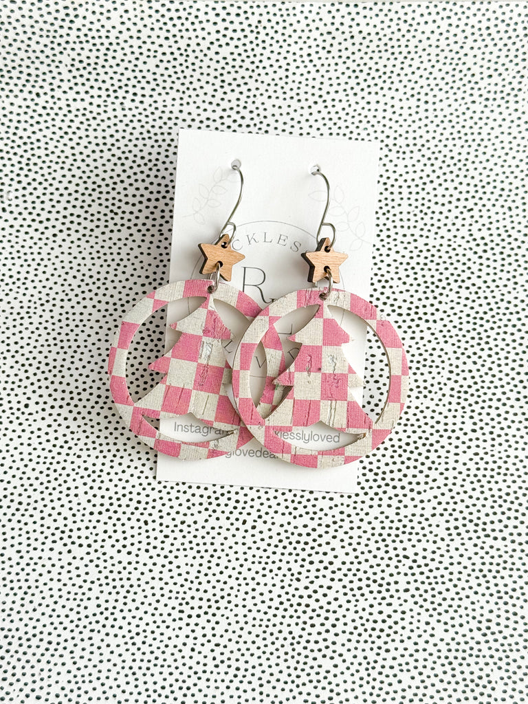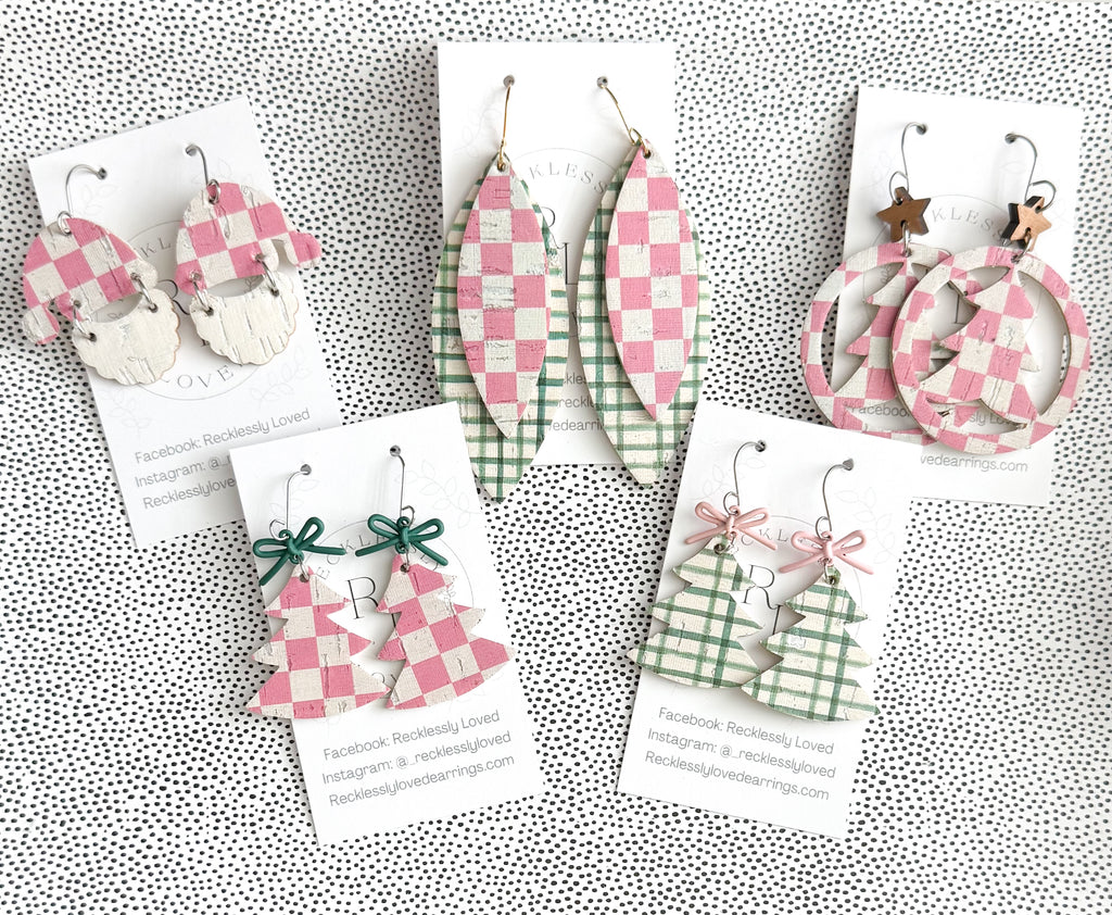 Bring retro vibes to your Christmas wardrobe with these fun earrings. Feel free to request a custom shape as well. Made with cork backed leather and surgical stainless steel hooks.